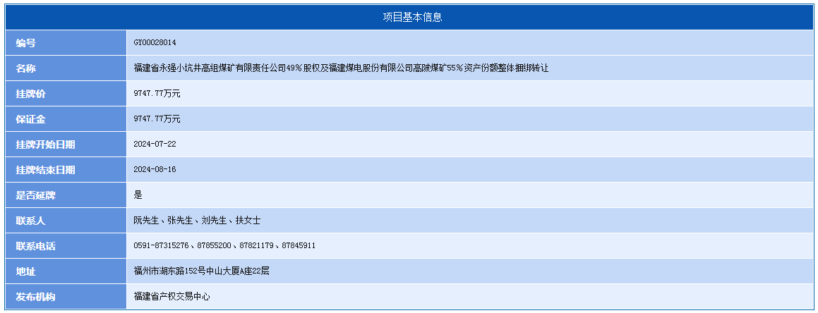 二、挂牌价:人民币9747.77万元(其中福建省永强小坑井高组煤矿有限责任公司49%股权为6496.31万元,福建煤电股份有限公司高陂煤矿55%资产份额为3251.46万元,若项目通过竞价成交,由此产生溢价按各标的挂牌价格与占比进行分配)。